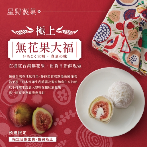 嚴選台灣在地新鮮無花果 碩大豐盈,甜而不膩,纖維細緻,適口性佳 靜待樹梢果實成熟後新鮮採收,保留最佳口感風味 熟果覆上日本雪印生乳酪醬及獨家綿密白豆沙餡 以手打糯米皮裹入整粒在欉紅無花果 嚐一嚐夏季專屬清爽香甜